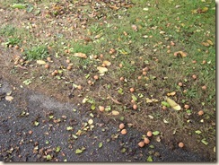 The nut harvest continues. Blustery day aside, the Barrell Man is underneath his walnut tree today when I walk by. Bucket in one hand, cane in the other, he’s gathering the nuts loosened by last night’s windstorm. “How goes the harvest?” I ask. “We’ve shelled out one hundred fifty pounds so far,” the Barrell Man replies. He plunks a couple walnuts in his bucket, laughs and says, “The wife gives me hell whenever I come in with more.” And that’s a direct quote.